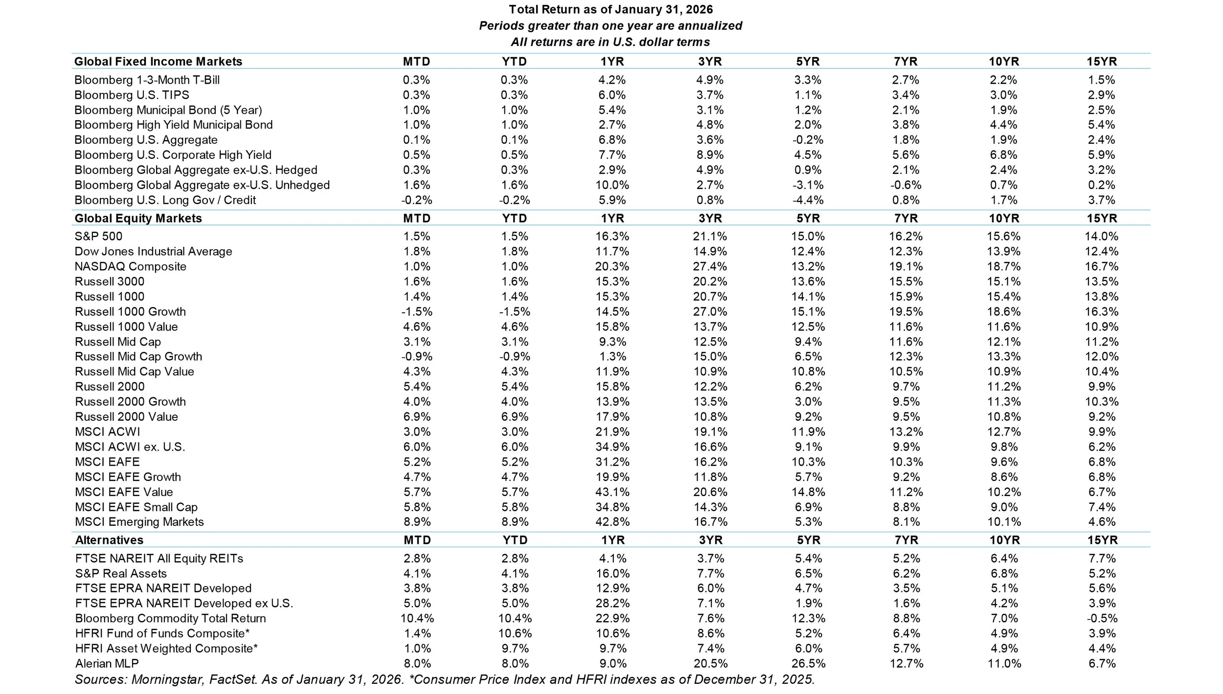 • Equity sector returns are calculated by S&P, Russell, and MSCI for domestic and international markets, respectively. S&P and MSCI sector definitions correspond to the GICS® classification (Global Industry Classification System); Russell uses its own sector and industry classifications.