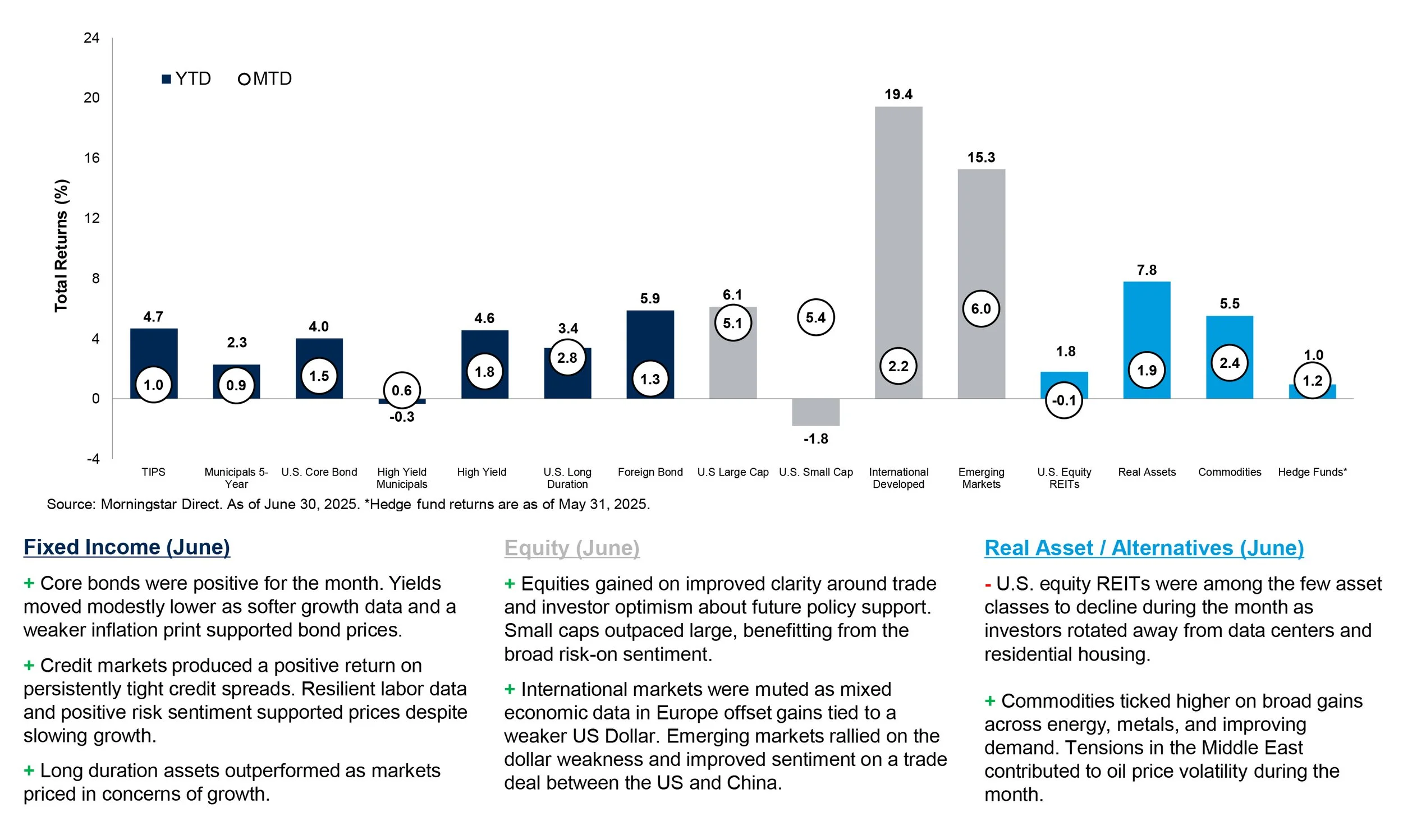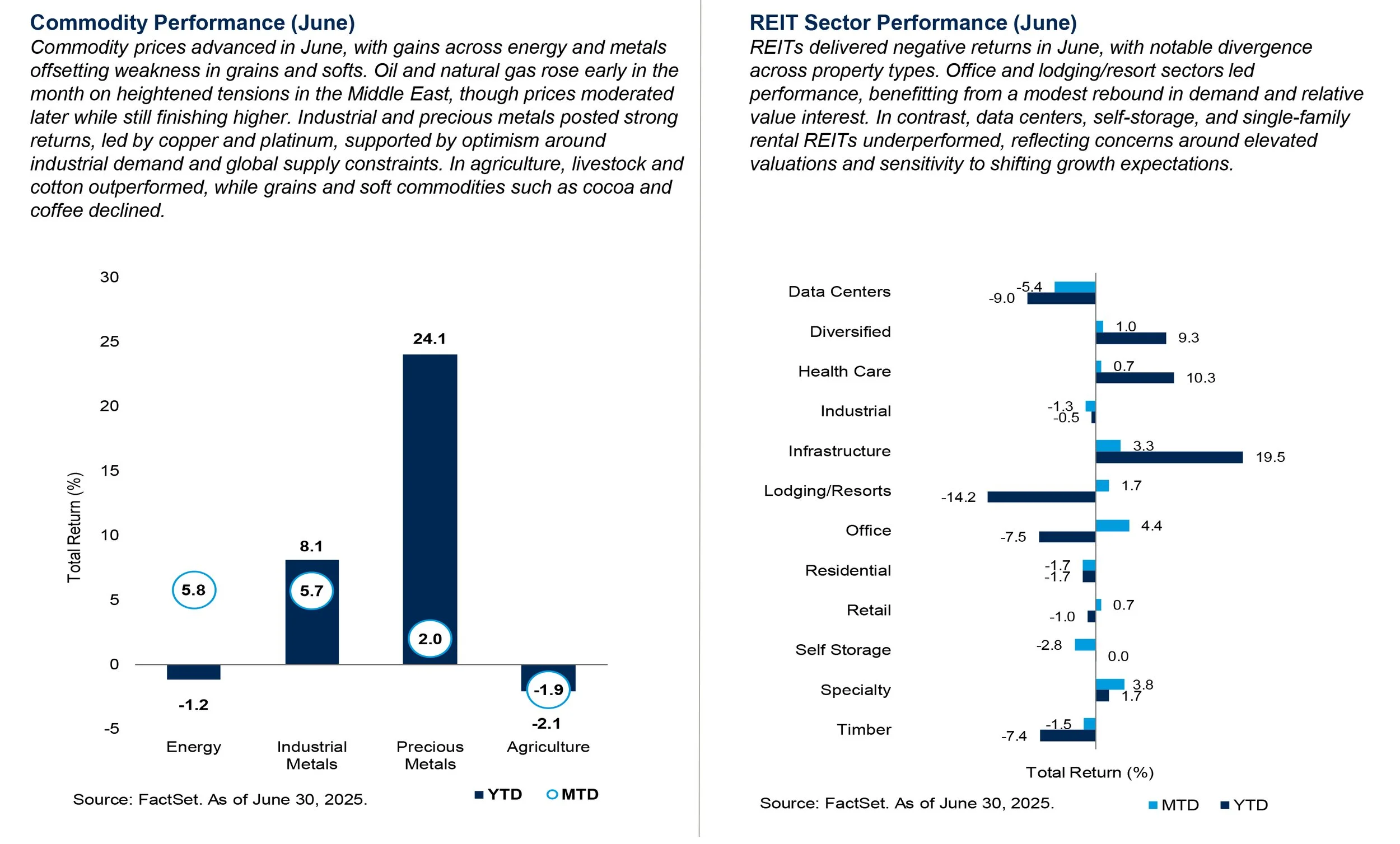 • Equity sector returns are calculated by S&P, Russell, and MSCI for domestic and international markets, respectively. S&P and MSCI sector definitions correspond to the GICS® classification (Global Industry Classification System); Russell uses its own sector and industry classifications.